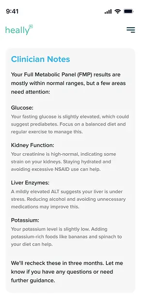 Every test result is carefully analyzed by our expert Clinical Team, who examines each biomarker to create a clear, comprehensive picture of your health status. Our licensed healthcare providers translate complex lab data into actionable insights, helping you understand exactly what your results mean for your wellbeing. For any concerning findings, our clinicians will contact you directly to discuss the results and recommend appropriate next steps.